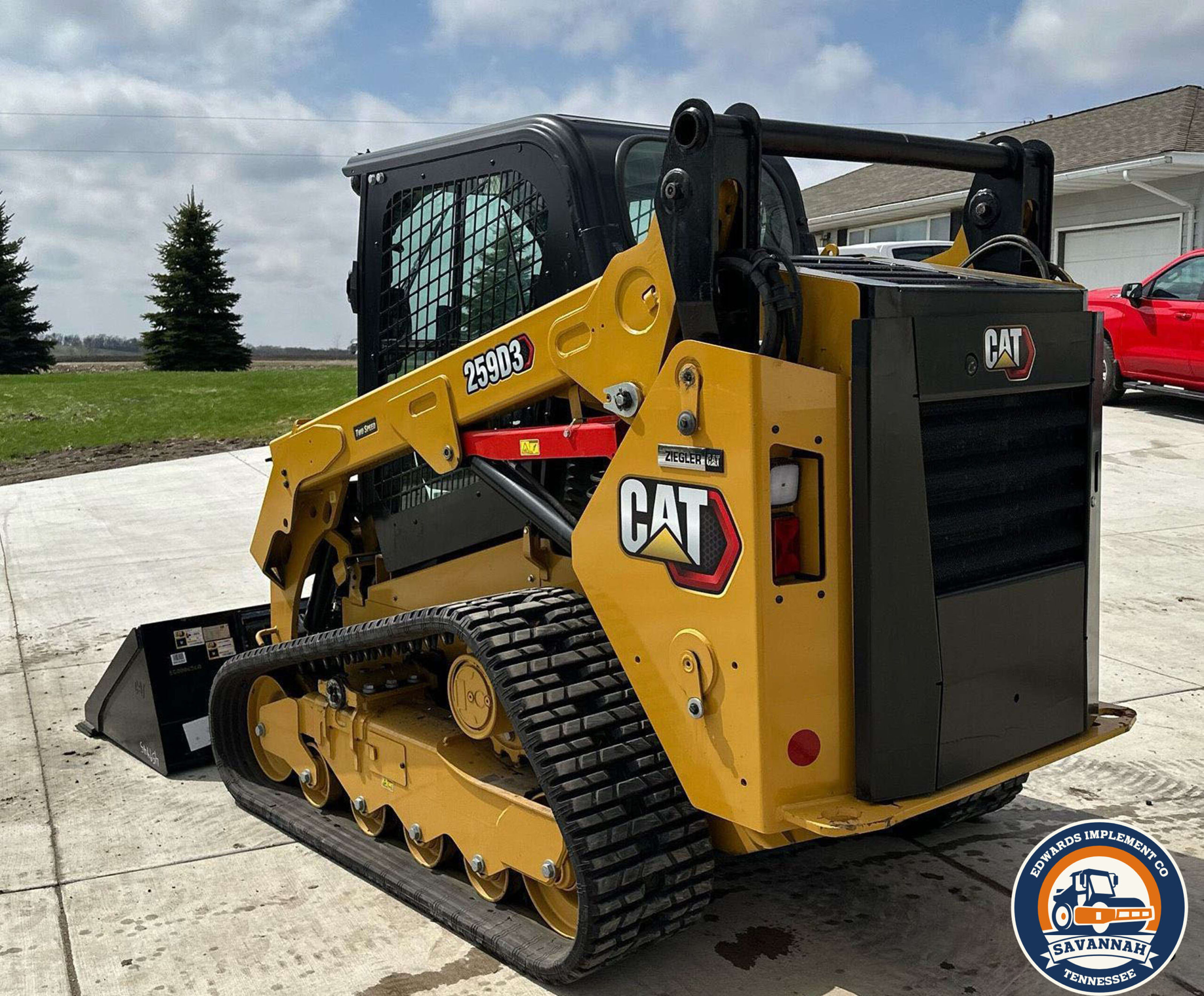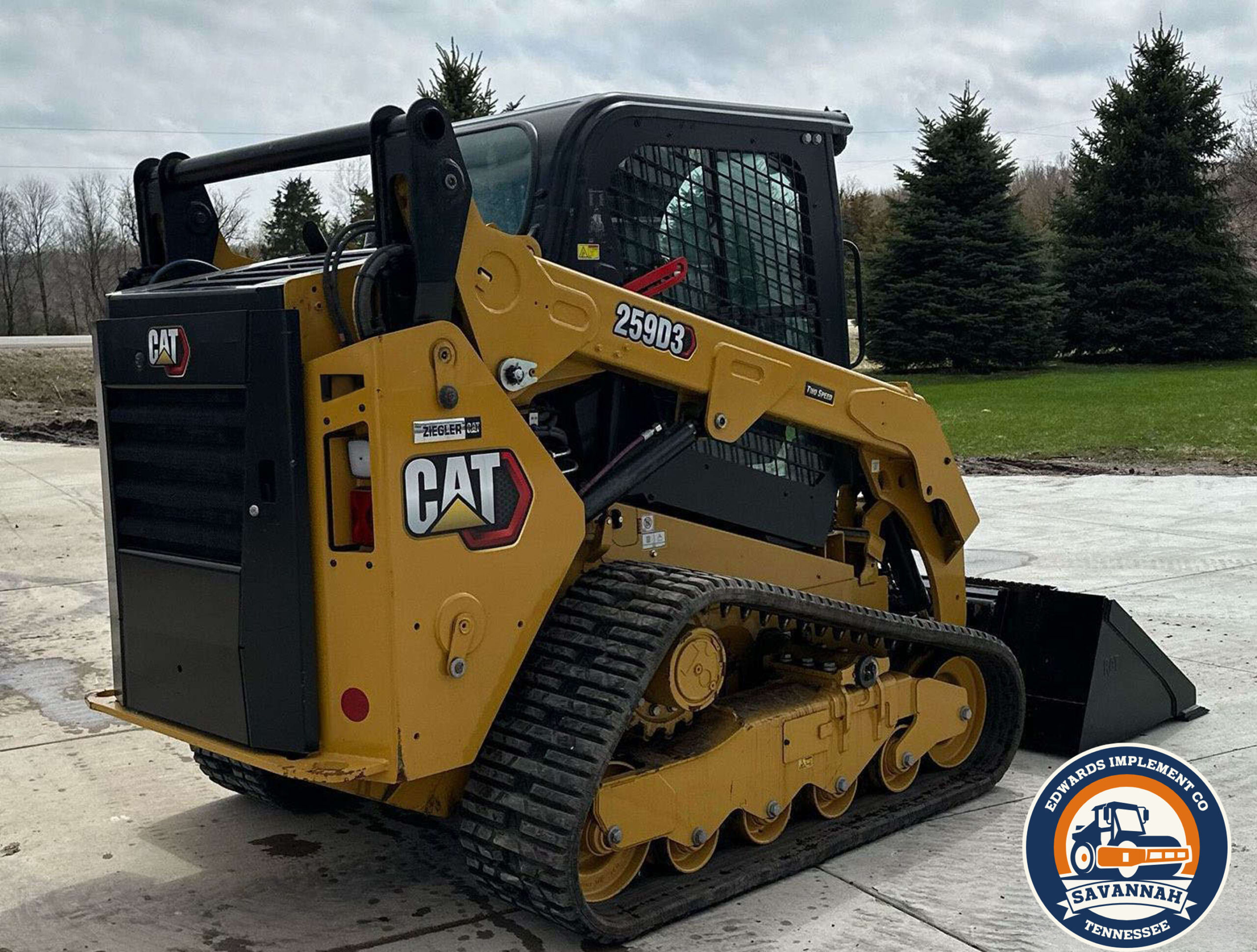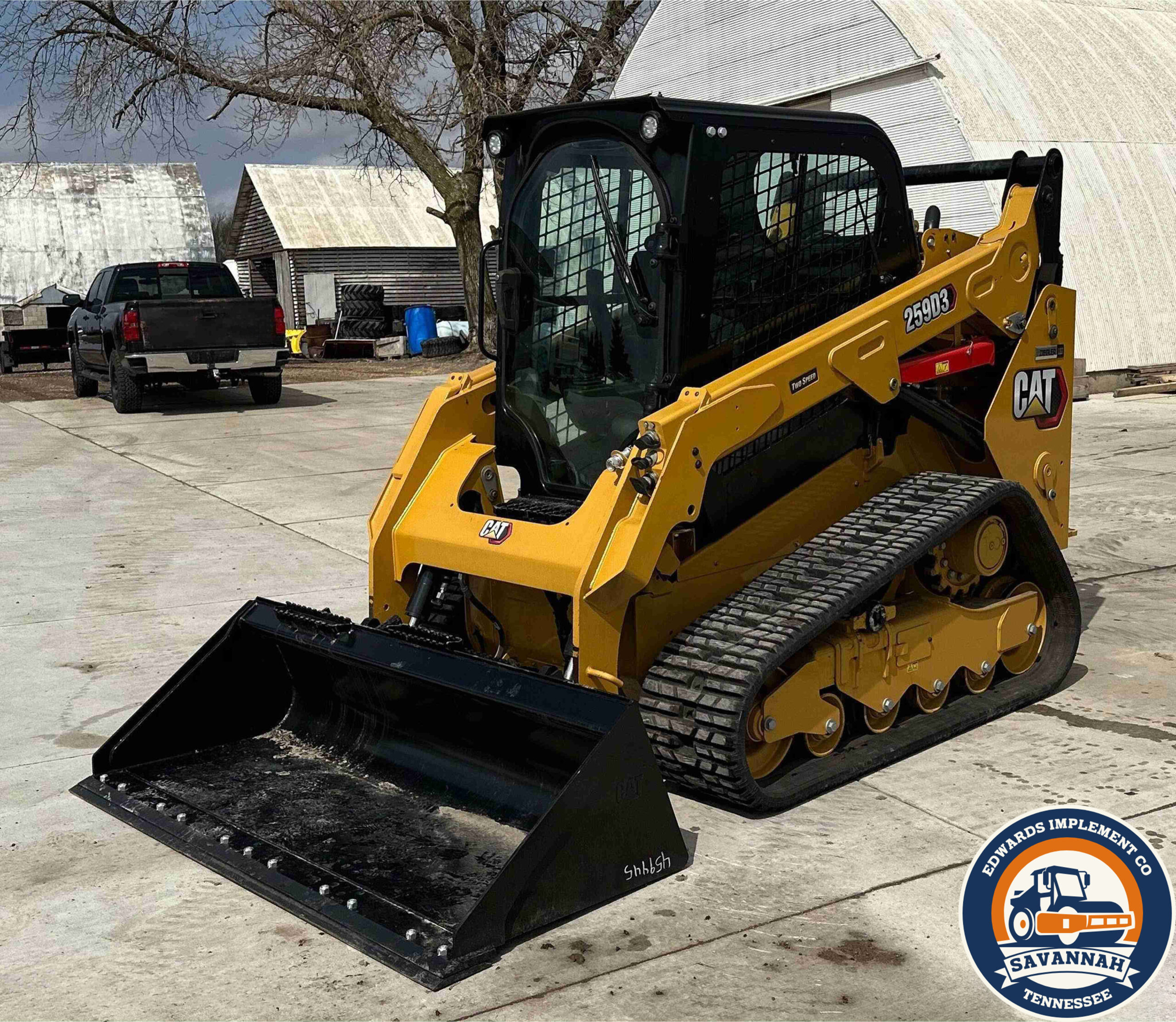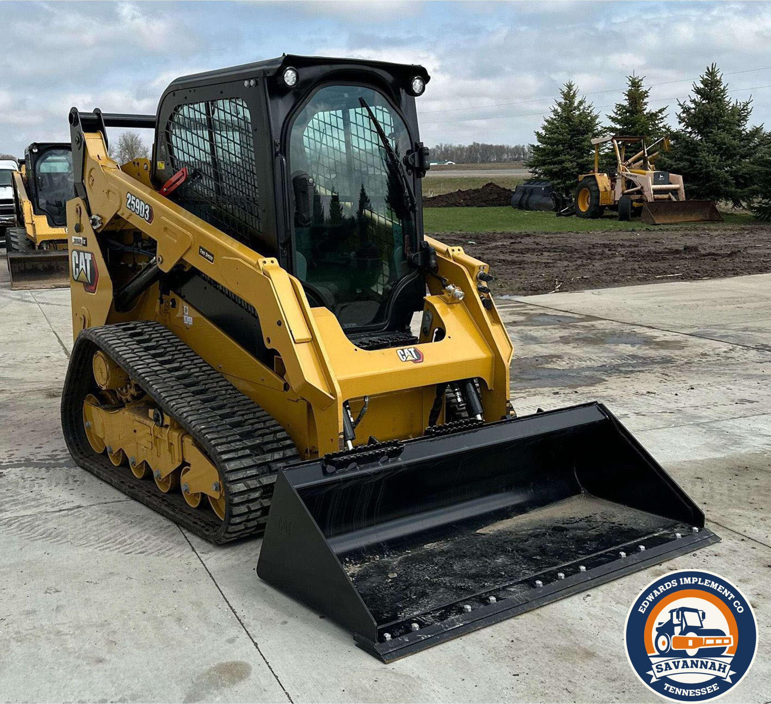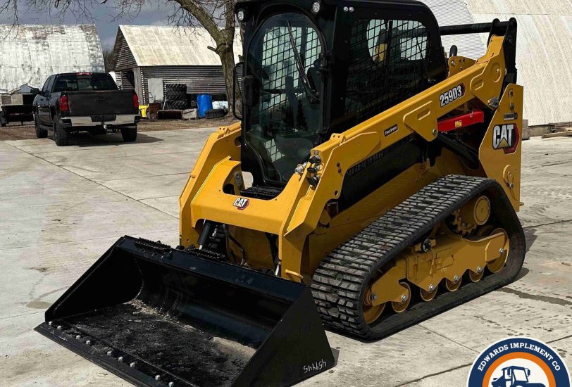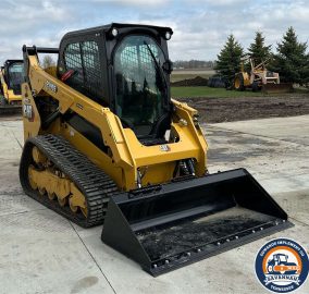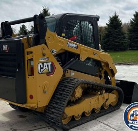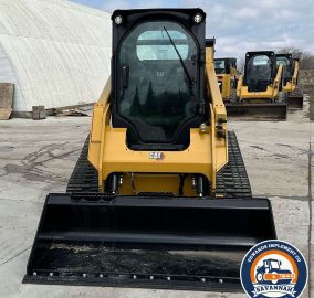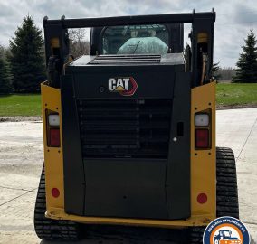 2022 Caterpillar 259D3 tracked skid steer loader with only 29 hours. Powered by a 54.6 kW Caterpillar C3.3B 4-cylinder diesel engine and hydrostatic transmission with two-speed travel. Features EROPS with AC and heat, hand-operated bucket control, and an electronic monitoring system. Equipped with auxiliary hydraulics, auxiliary electrical outlet, and a hydraulic quick coupler. Includes a 0.57 cu.yd. Caterpillar bucket (73" wide, bolt-on cutting edge) and 15.5" wide Caterpillar tracks.
